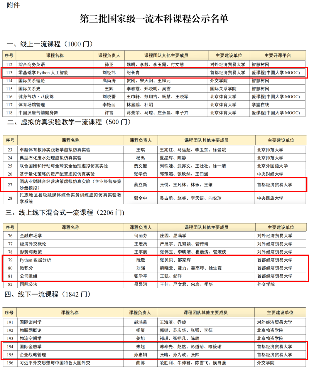 作为北京市高水平研究型财经大学,学校在国家级一流本科课程建设方面保持着良好的发展态势。此前,学校已有“服务营销”“微观经济学”等9门课程成功获批国家级一流本科课程,加上本次新增的7门课程,学校国家级一流本科课程数量实现了跨越式增长,与25个国家级一流本科专业建设点形成了相互支撑、协同发展的良好格局,为“三型一化”高水平财经人才培养构建了优质的课程体系。