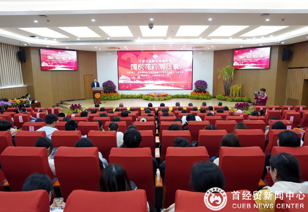 10月28日,由首都绿化委员会办公室主办,丰台区园林绿化局协办,首都经济贸易大学承办的“千家万盆鲜花祝福 国庆花坛花卉到我家”赠花仪式在我校博学楼学术报告厅圆满完成。北京市园林绿化局党组成员、副局长林晋文,丰台区政府党组成员、副区长尹航,首都经济贸易大学党委副书记、校长吴卫星,首都经济贸易大学党委常委、副校长杨奎出席活动。
