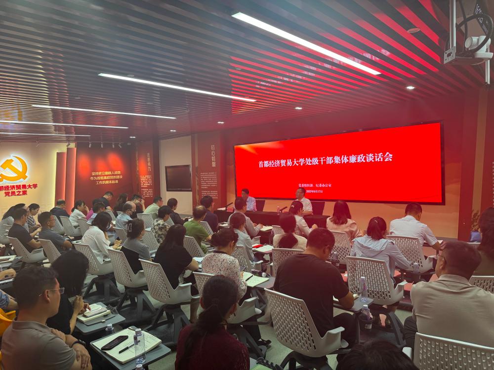 首经贸开展新任处级干部及试用期满处级干部集体廉政谈话9月17日下午,校党委副书记欧阳沁,党委常委、纪委书记毛百战对新任处级干部及试用期满处级干部开展集体廉政谈话。党委常委、党委组织部部长赵广,纪委副书记、纪委办公室主任、监察专员办公室综合室主任商筱辉一同参加。集体谈话由欧阳沁主持。 毛百战代表学校纪委对处级干部进行了廉政谈话,强调任前廉政谈话是干部选拔任用的必经程序,是党风廉政教育的重要载体,是党内监督的一种重要方式,引导新任处级干部进一步增强政治意识,严守纪律规矩,做到忠诚履职尽责。一要立场坚定、头脑清醒,做政治坚定的明白人。二...部处