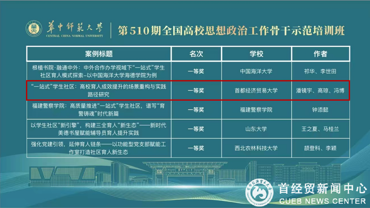 近日,由教育部思想政治工作司主办、教育部高校思想政治工作队伍培训研修中心(华中师范大学)承办的第510期全国高校思想政治工作骨干示范培训班在武汉开班,本次培训班主题为“‘一站式’学生社区模式下辅导员育人能力提升”,来自全国部属高校、部省合建高校和省属高校的106名思想政治工作骨干参加培训。我校工商管理学院辅导员潘镜宇受派参训,其撰写的工作案例《“一站式”学生社区:高校育人成效提升的场景重构与实践路径研究》(作者:潘镜宇、高琼、冯博)跻身前五名,获评“优秀案例一等奖”。