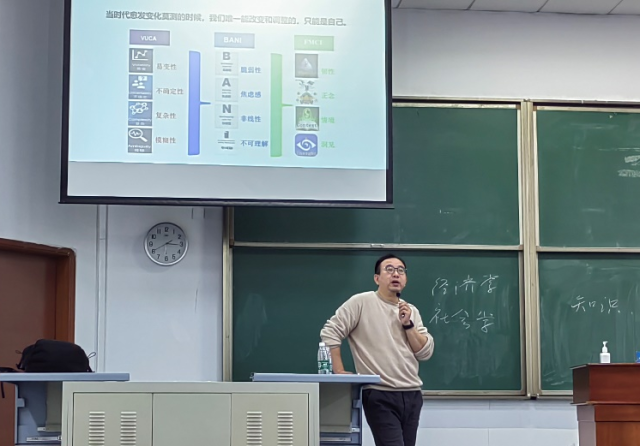白云指出,当下最大的特点是“不确定性”和“脆弱性”并存。他通过使用近期的热门话题“ChatGPT”提问、互动、作诗等例子生动体现了时代发展和技术变革之快,强调了在知识极易获取的背景下人类思考与处理信息的能力将被替代的事实。随后,白云对“乌卡时代”和“巴尼时代”等新名词的阐释,并指出我们面临的“不确定性”正是“乌卡时代”的主要特征,希望大家能够在识变、求变、应变中做好发展规划。