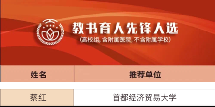 近期,北京市教育工会公布了“育人榜样(先锋)”推荐系列活动的获奖名单,工商管理学院蔡红教授获评“教书育人先锋”。
