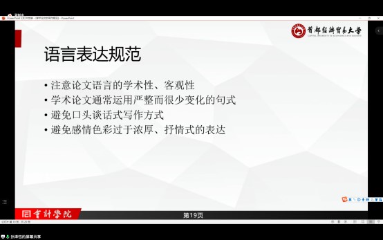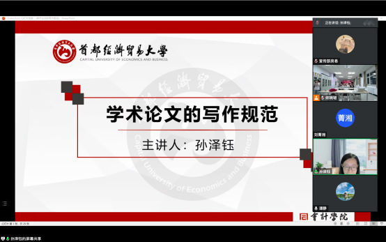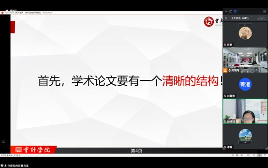 4月13日晚,会计学院举办本学期“学术达人”讲座第一讲,本次讲座邀请到孙泽钰老师作为主讲人,讲座主题为学术论文的写作规范。本次学术达人活动采用线上线下相结合的方式举行,会计学院众多学子认真聆听了本次讲座。