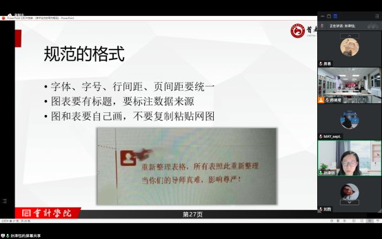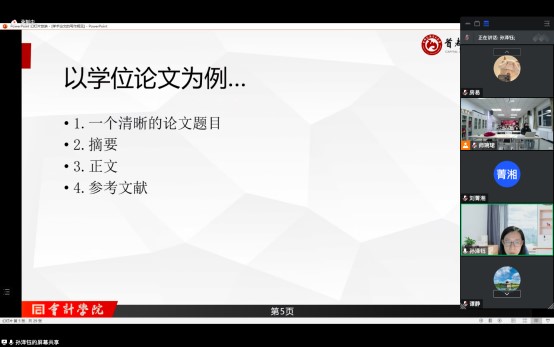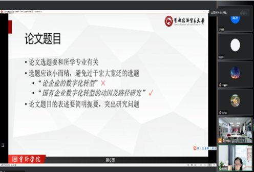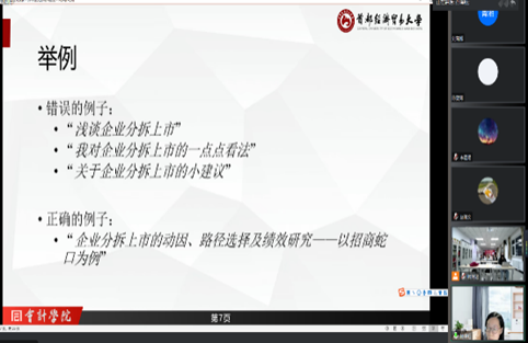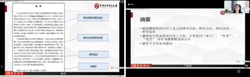 首先,孙泽钰对论文题目的选择与撰写进行了讲解,强调了论文题目的选取要结合所学专业内容,作为会计专业的学生,选题应与会计、财务管理、审计等专业相关;同时,论文选题应该短小而精炼,避免过于宏大宽泛的选题;此外,论文题目的表述应该简明扼要,突出研究重点。随后,孙泽钰向同学们展示了论文题目的错误事例,并展示了正确的论文题目应该如何撰写,帮助同学们进一步明确应当如何选取学位论文题目。