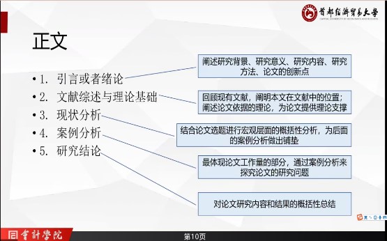 关于论文的正文部分,孙泽钰指出正文是论文的主体部分,也是最重要的一部分,并向同学们详细讲解了正文的各部分内容。论文正文包含:引言(也可称绪论)——阐述研究背景、研究意义、研究内容、研究方法和论文的创新点;文献综述与理论基础——回顾现有文献,阐明本文在文献中的位置,阐述论文依据的理论,为论文提供理论支撑;现状分析——为结合论文选题进行宏观层面的概括性分析,为后面的案例分析做出铺垫;案例分析——是最体现论文工作量的部分,通过案例分析来探究论文的研究问题;研究结论——是对论文研究内容和结果的概括性总结。