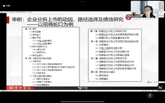 接着,孙泽钰以《企业分拆上市的动因、路径选择及绩效研究——以招商蛇口为例》的摘要为例,向同学们展示了论文摘要中包含的具体内容,包括研究背景、研究目的、研究方法、研究内容、研究结果以及关键词。此外,孙泽钰强调在论文摘要的撰写过程中,应全程使用第三人称。