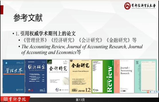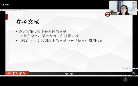 为方便同学们理解,孙泽钰将参考文献同文献综述进行了合并讲解,强调参考文献一定是在论文中引用过的期刊论文、学术专著和科技报告等,切记不可以使用百度百科。为了使同学们明确参考文献的引用范围,孙泽钰列举了多个国内外权威期刊供同学们参考。