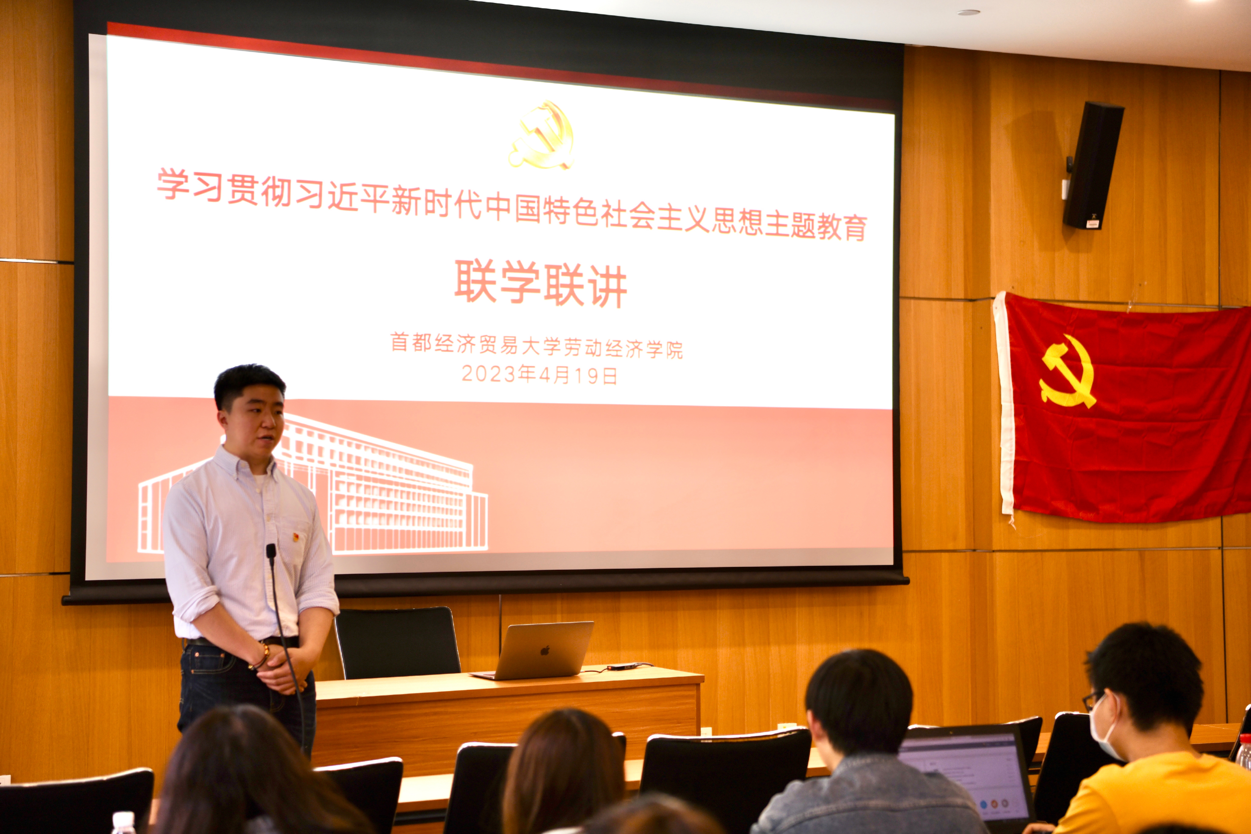 4月19日下午,劳动经济学院开展学习贯彻习近平新时代中国特色社会主义思想主题“联学联讲”活动。本次活动邀请中共中央党校(国家行政学院)马克思主义学院研究生段丹天和首经贸劳经学院2021级人力资源开发与人才发展专业研究生余昕阳就中国高质量发展主题进行宣讲。劳动经济学院学生党员及入党积极分子参加本次活动。