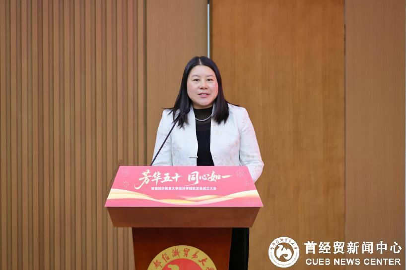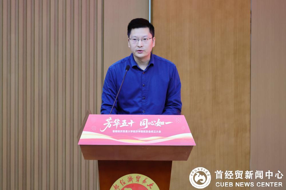 李鲲鹏代表学校对经济学院校友会的成立表示热烈祝贺,从筚路蓝缕到蒸蒸日上,他充分肯定了经济学院五十一年来在学科建设、人才培养与服务首都发展等方面取得的扎实成果。他对新成立的经济学院校友会提出三点希望:一是成为“温暖的港湾”,增强“经院人”的归属感与凝聚力;二是成为“互促的平台”,通过校企合作、导师引领等方式,实现校友与学院发展的同频共振、互利共赢;三是希望校友成为“母校的名片”,继续在各自领域发光发热,汇聚正能量,共同助力学院、学校乃至社会的高质量发展。