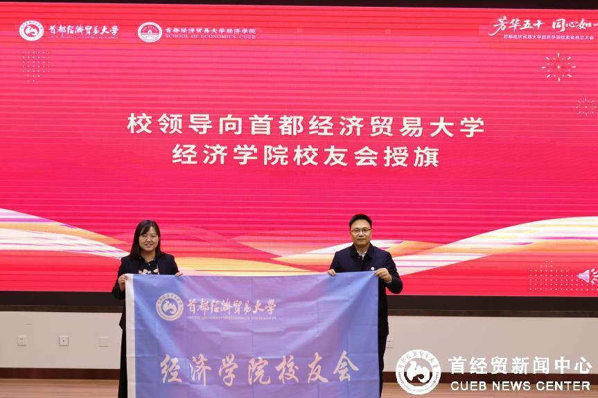 随后,全体与会领导、校友和师生代表一同观看了身处世界各地的“经院人”送上的诚挚祝福。在热烈的氛围中,李鲲鹏向经济学院校友会授旗,标志着校友会正式启动运行。