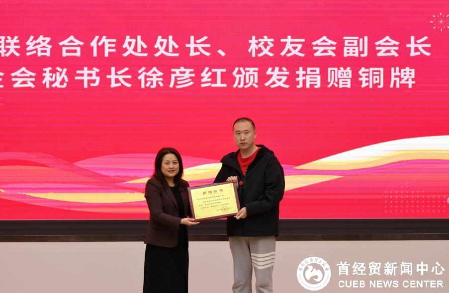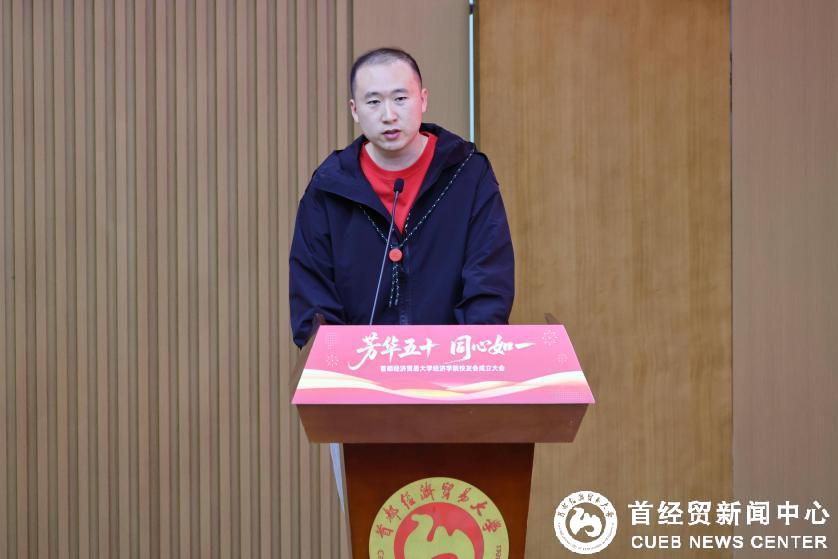 捐赠人北京金盛熙投资管理有限公司创始人、总经理、2005级经济学(实验班)校友周梦楠在发言中深情回顾了在母校求学的青葱岁月,表达了对恩师教诲与同窗情谊的深切感激。他多年来持续以实际行动回馈学院:自2016年设立助学金,帮扶学子追逐梦想;在招聘中优先考虑首经贸毕业生;并于近期携手学院举办首届ETF模拟交易大赛,吸引全校超350名同学参与。他衷心祝愿学院校友会越办越好,助力校友成长与学院发展同频共振。