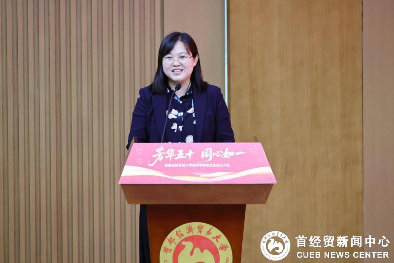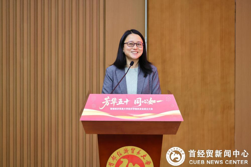 杜雯翠在发言中衷心感谢了学校、各界校友和学院师生的支持,并介绍了经济学院的卓越办学成果——踏浪于时代潮流,如今已是拥有理论经济学、应用经济学两个一级学科博士点的学院,积极建设起数字经济本硕专业,经济学教师团队成功入选“全国黄大年式教师团队”创建示范团队,为培育栋梁之材奠定坚实基础。她阐述了优秀校友与经院教育人民属性的内涵,并表示学院校友会将为经院学子搭建起温暖、有力的互动平台、彼此团结友爱,将经院之火代代相传,共同写就更加辉煌的历史篇章。