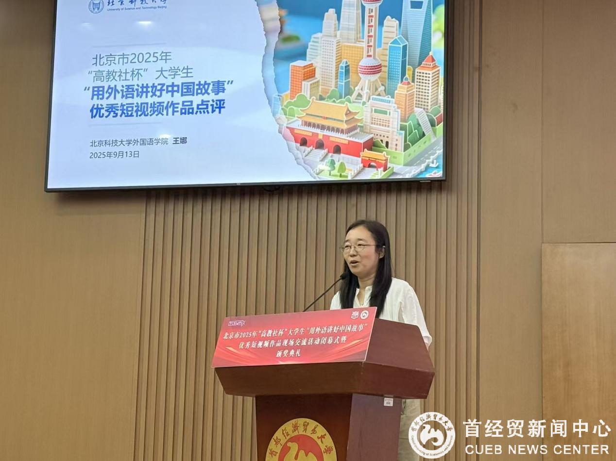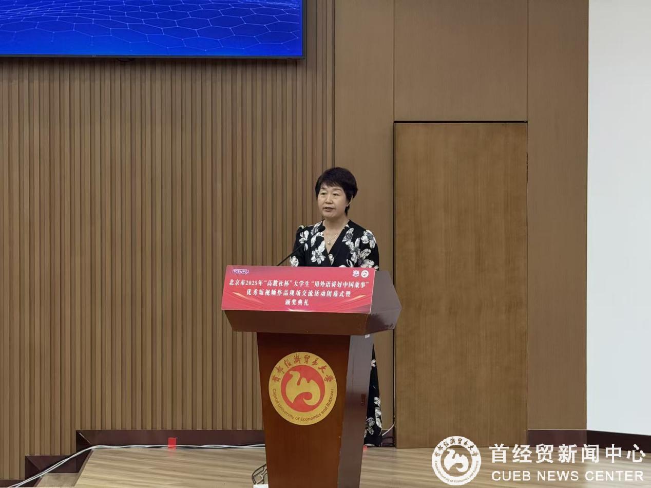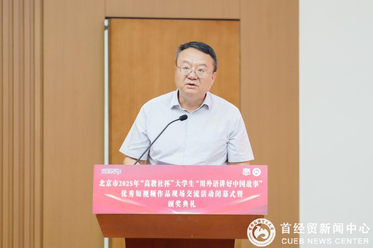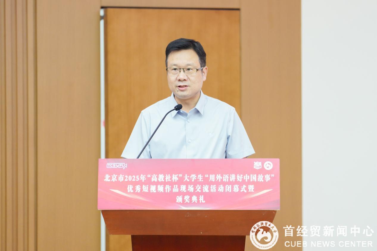 金秋时节,硕果盈枝。9月13日上午,北京市2025年“高教社杯”大学生“用外语讲好中国故事”优秀短视频作品征集活动颁奖典礼在首都经济贸易大学博学楼报告厅隆重举行。本次活动由北京市教育委员会高等教育处与高等教育出版社联合主办,首都经济贸易大学承办,北京市高教学会大学外语研究分会、北京市高校外语课程思政联盟协办。北京市教育委员会高等教育处处长李惊涛,首都经济贸易大学党委常委、副校长李鲲鹏、北京市高教学会大学英语研究分会理事长、北京大学外国语学院党委书记李淑静、高等教育出版社副总编辑贾瑞武、高等教育出版社外语出版事业部主任肖琼、北京第二外国语学院校党委常委、统战部部长兼教务处处长张喜华出席颁奖典礼。来自首都35所高校的师生代表齐聚一堂,共赴一场青春与创意、外语与文化的盛会。