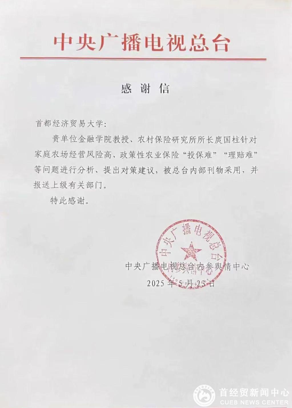 此前,中央广播电视总台专程致函首都经济贸易大学,对庹国柱在分析家庭农场经营风险、研究政策性农业保险“投保难”“理赔难”问题及提出对策建议等方面作出的贡献表示认可与感谢。