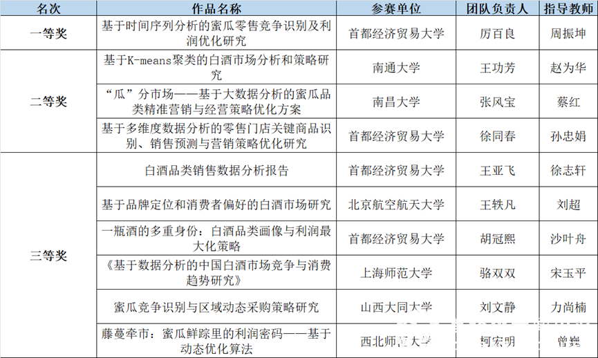 经评定,作品《基于时间序列分析的蜜瓜零售竞争识别及利润优化研究》获一等奖,《基于K-means聚类的白酒市场分析和策略研究》等3件作品获二等奖,《基于多维度数据分析的零售门店关键商品识别、销售预测与营销策略优化研究》等6件作品获三等奖。